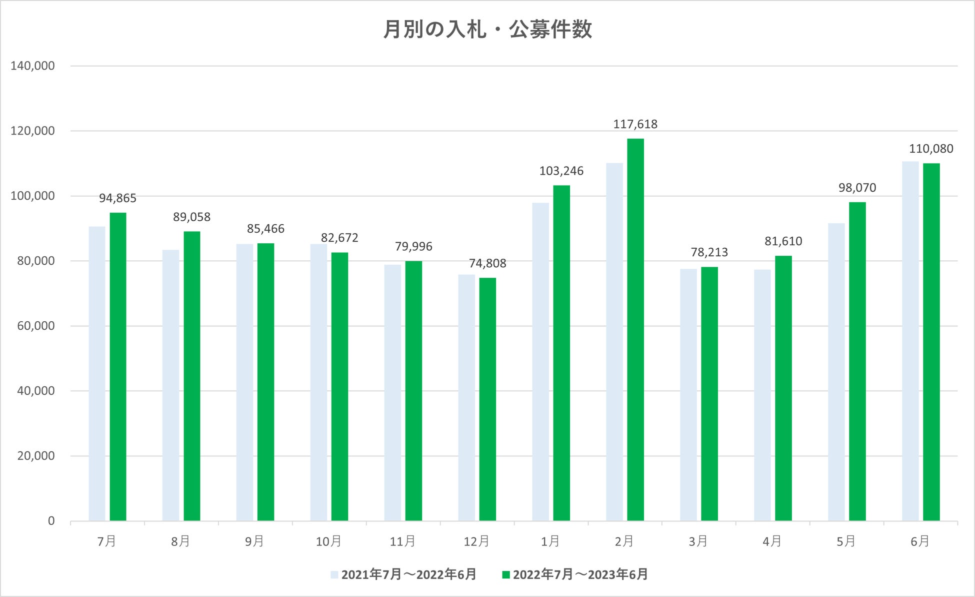 3か月連続で案件数が増えて、6月には11万件を超える入札・公募情報が登録されました。