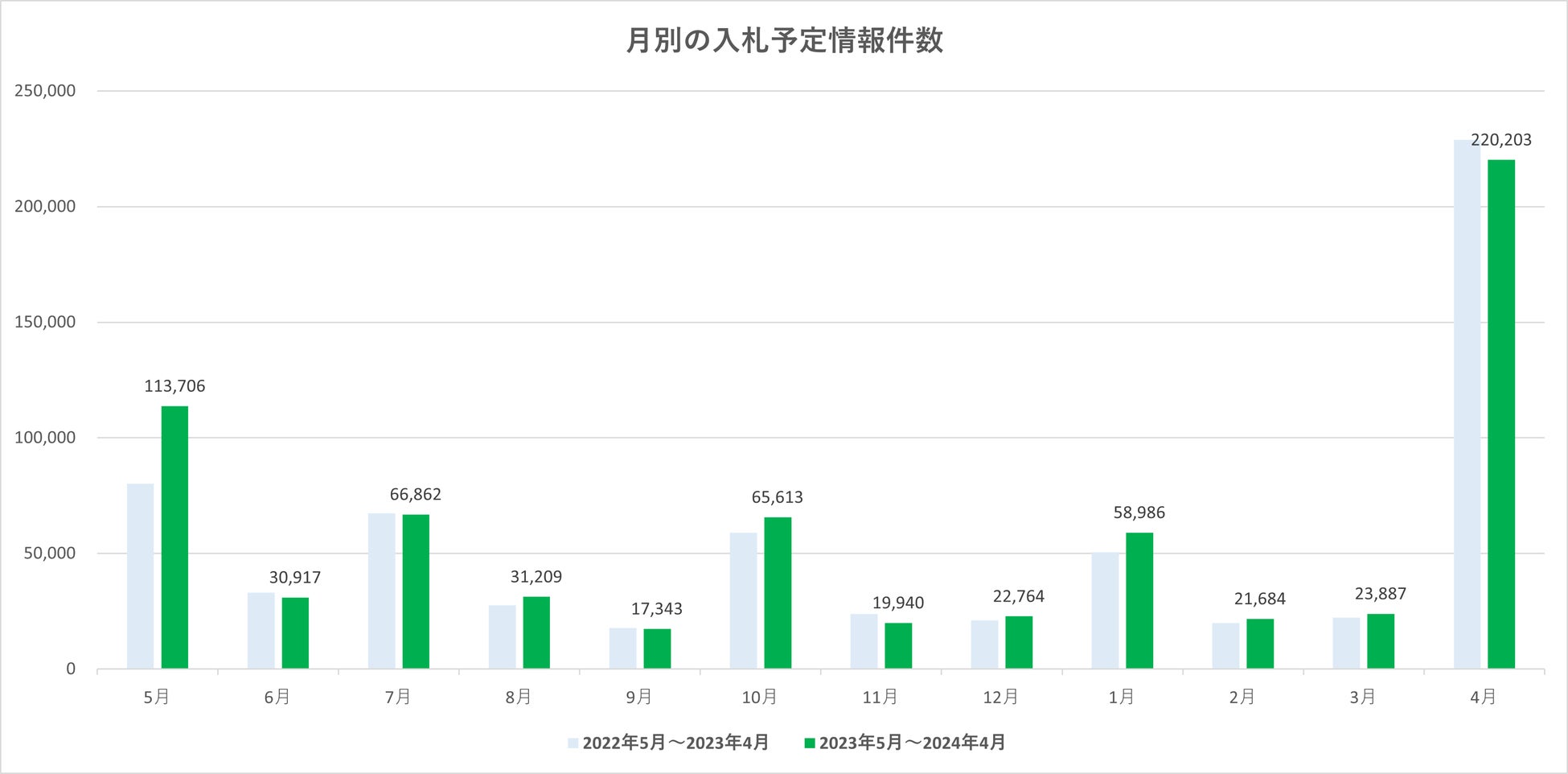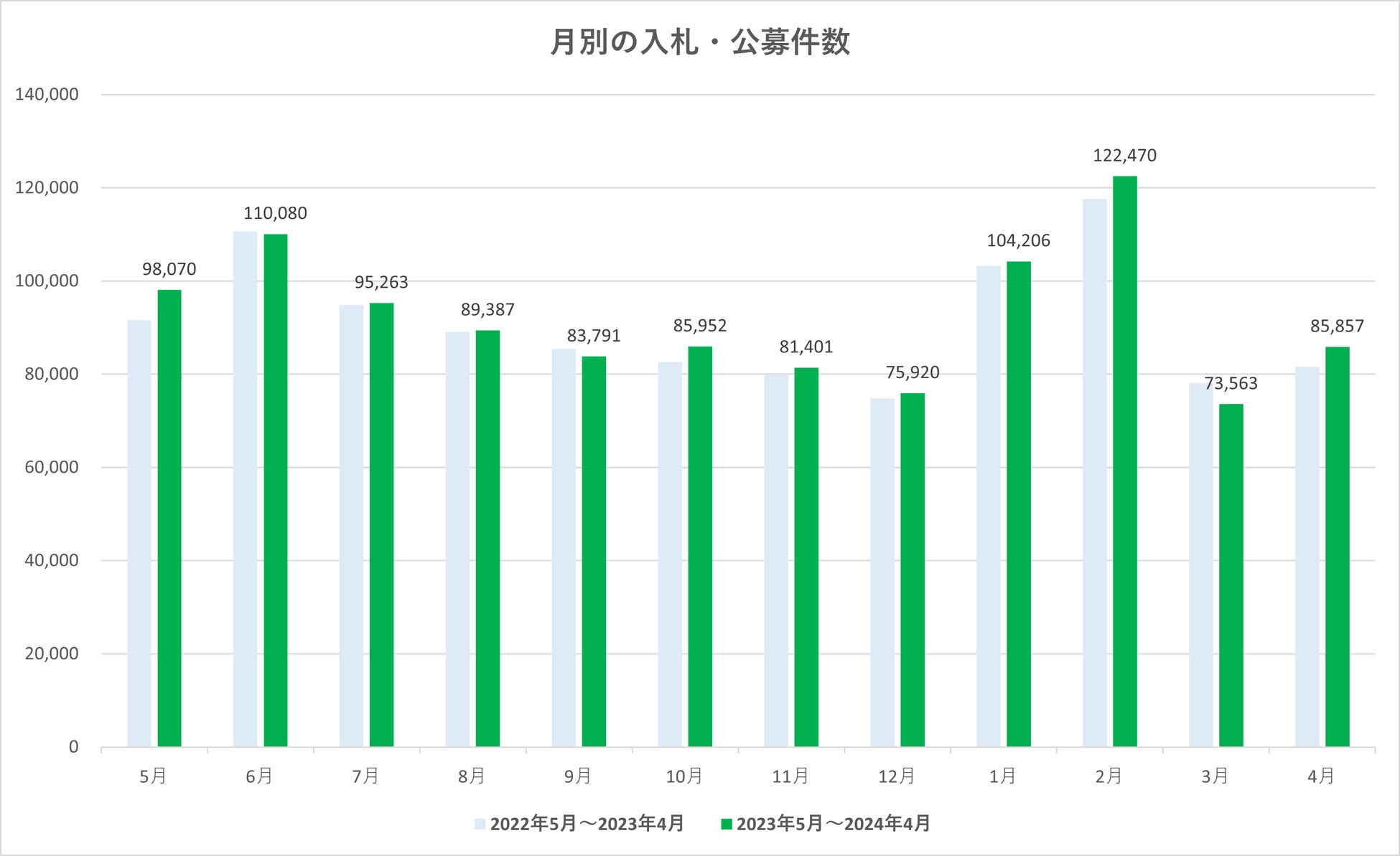 3月は年度末で入札・公募件数が少なかったですが、新年度が始まり案件数が増加しました。2023年4月と比較すると4,000件ほど増えていることもわかりました。5月、6月と件数が増えていくと思われますが、同様に昨年度を上回るのか注目です。
