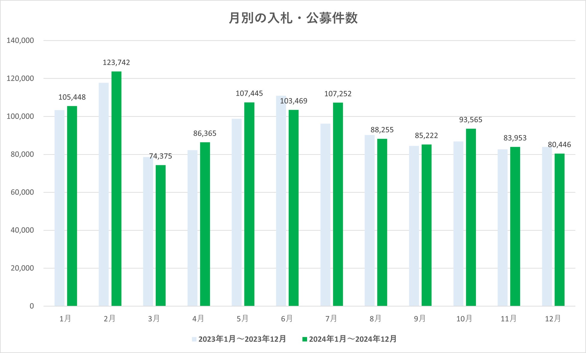 2024年12月は11月と比較すると入札・公募件数が減少しました。2023年は12月の方が11月よりも件数が多かったので、昨年度とは異なる動きになったことがわかります。