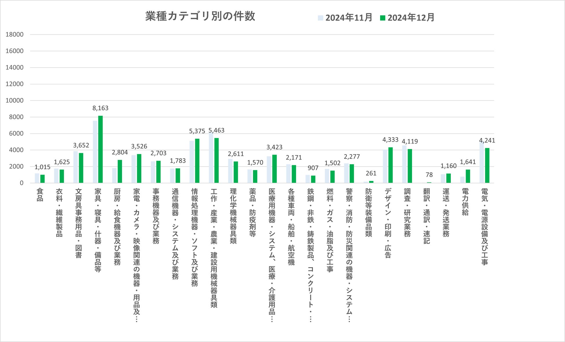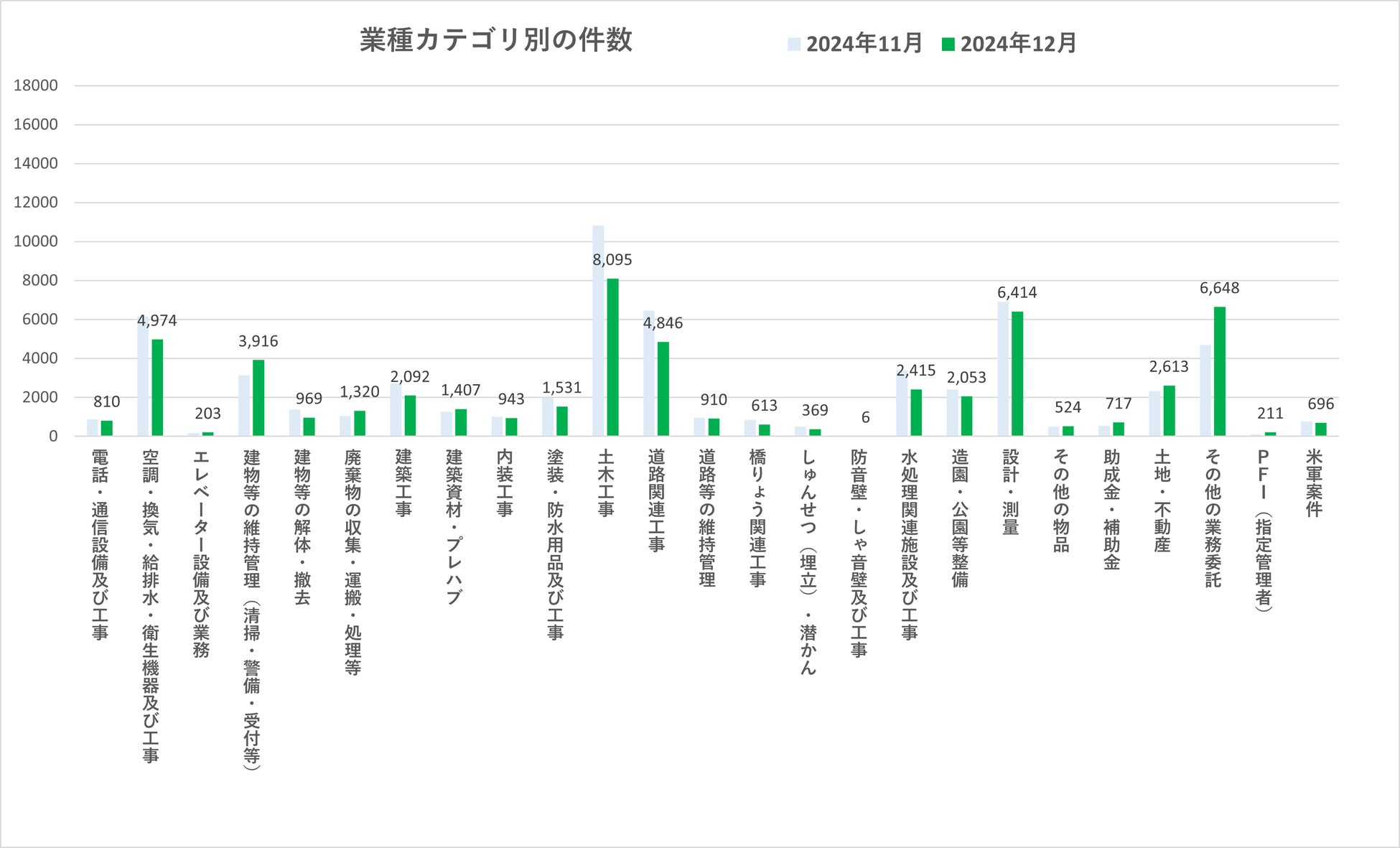 2024年12月は、家具・寝具・什器・備品等の件数が最も多くなりました。土木工事は11月に比べて、2,700件以上も件数を減らしました。また、案件名に「令和7年度」を含むような、次年度契約に向けた入札・公募情報が増えており、建物等の維持管理(清掃・警備・受付等)、廃棄物の収集・運搬・処理等の案件数が増加しています。
