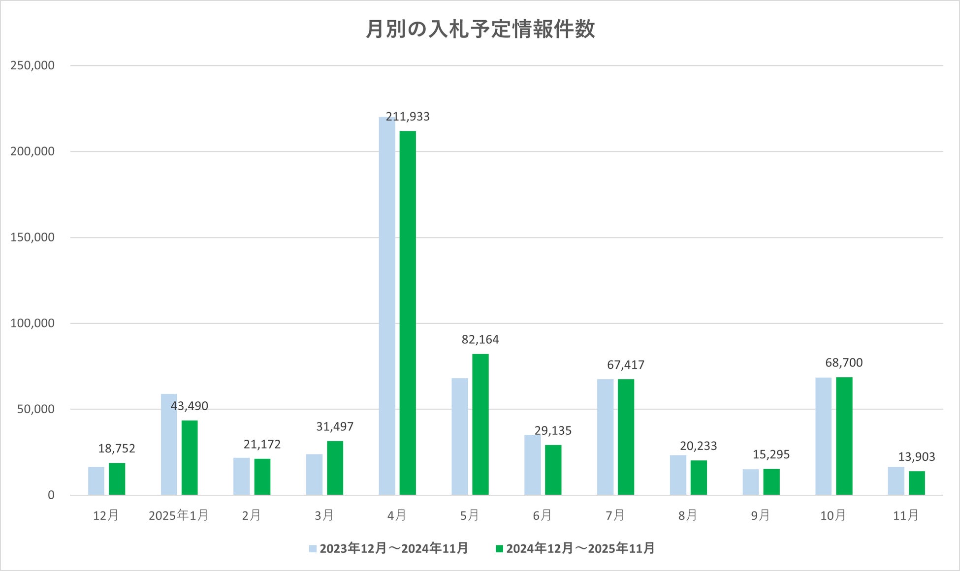 2025年11月の入札予定情報件数は13,903件でした。前月(2025年10月:68,700件)から54,797件の減少(前月比20.2%)となり、大幅に減少しました。前年同月(2024年11月:16,366件)と比較しても2,463件の減少(前年同月比85.0%)となっています。