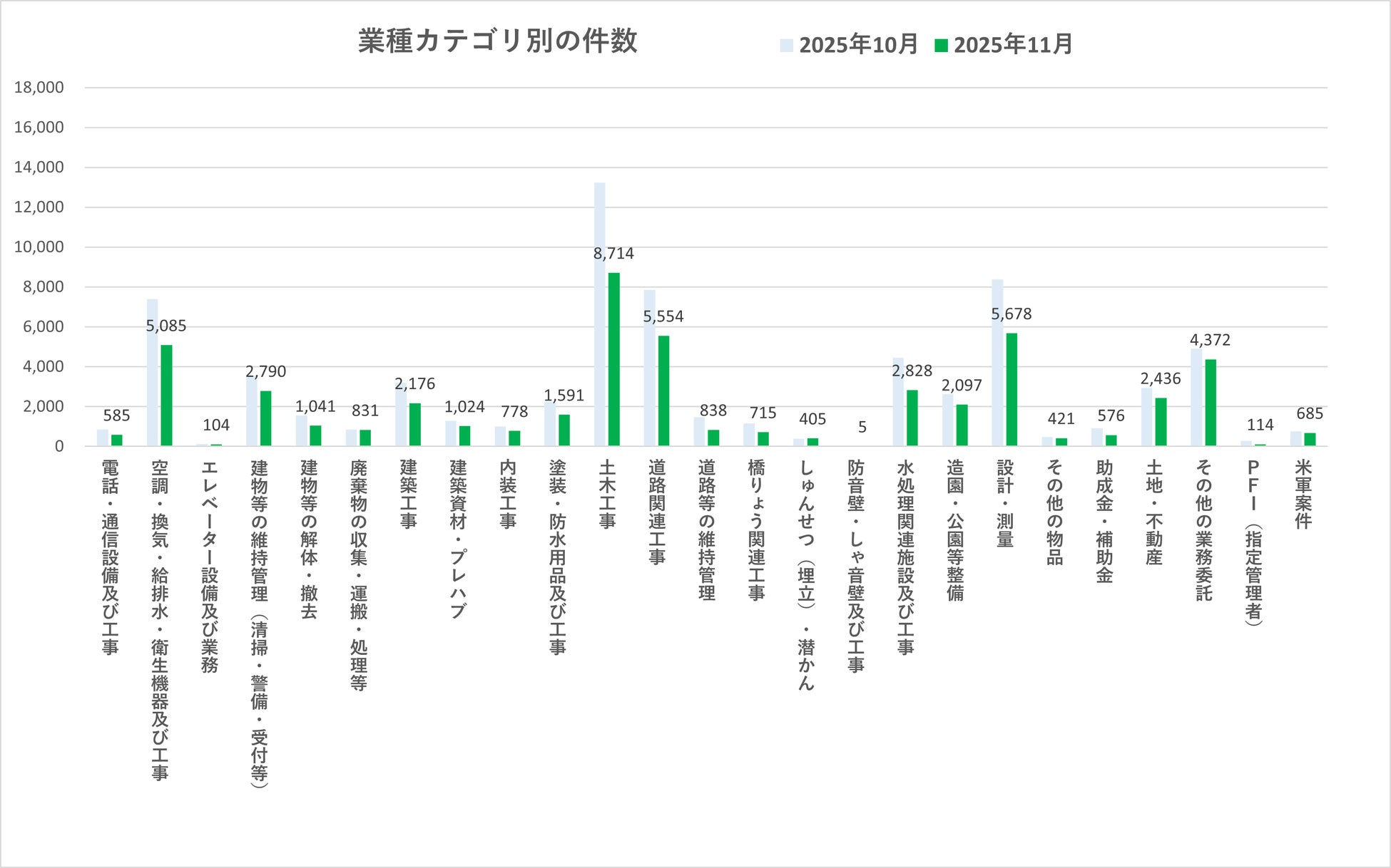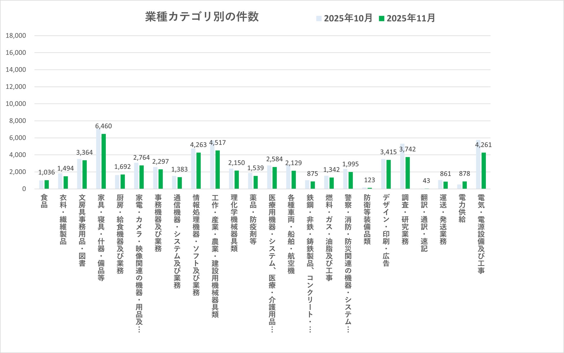 また、「調査・研究業務」は3,742件(前月比70.4%)、「建築工事」は2,176件(前月比67.9%)となり、委託・工事関連分野で件数の落ち込みが確認されました。