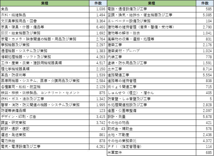 複数の業種カテゴリが1案件に付与されることがあるため、業種カテゴリの合計件数が月別の入札・公募件数にはなりません。